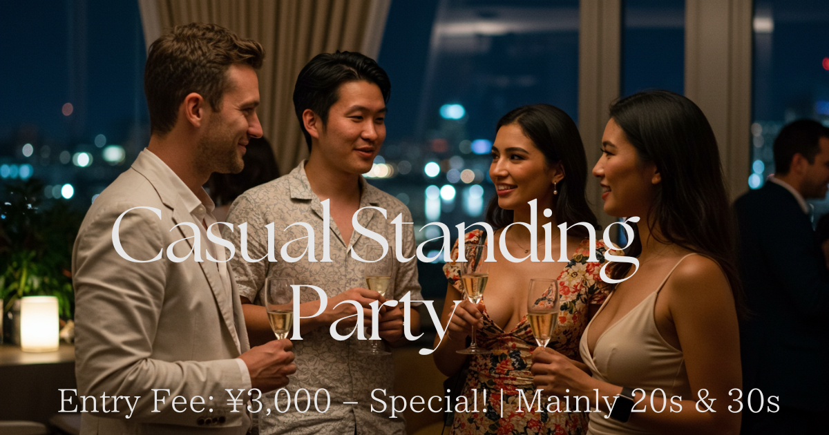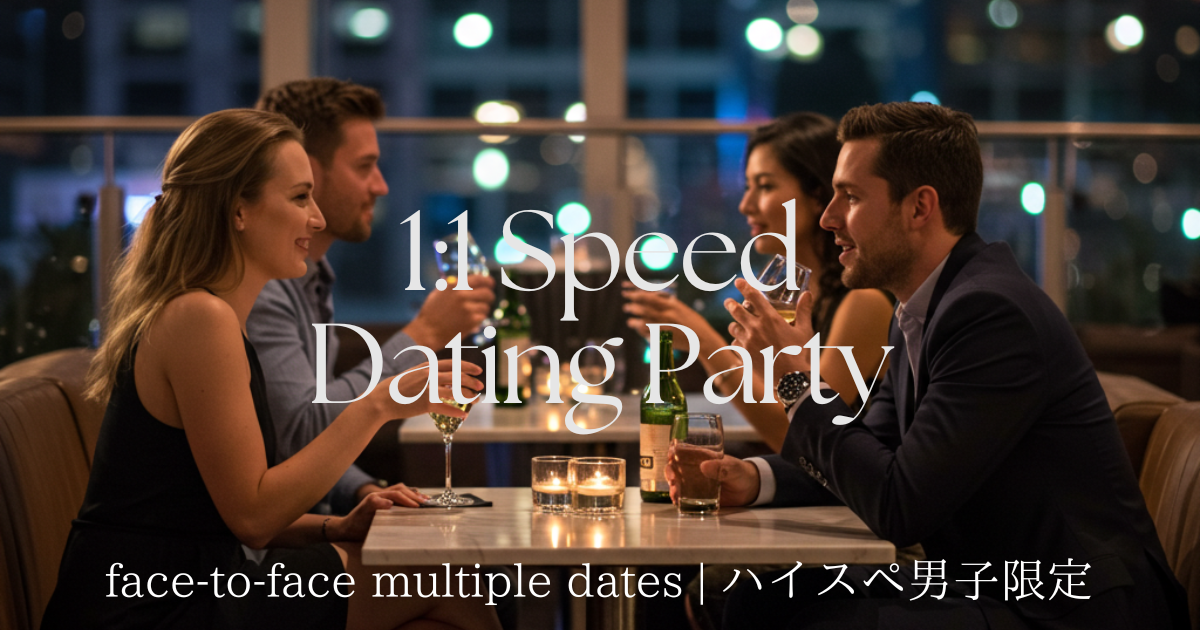🍸 厳選された軽食 + 多彩なドリンク飲み放題(Champagne付き)。人気ホテルで、1晩に多くの着席スタイルの1対1デートを楽しむ。毎回約60名が参加し大好評